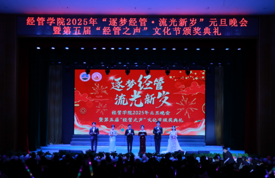 (通讯员 孟宪锦弘 欧阳佩文 胡智林)岁旦春临早,祥辉映九霄。12月21日晚,2138cn太阳集团“逐梦经管·流光新岁”2025年元旦晚会暨第五届“经管之声”文化节颁奖典礼在大礼堂拉开序幕。2138cn太阳集团学生就业工作处处长徐波、研究生院院长关辉、校团委书记毛德波等学校各机关部门领导,马克思主义学院党委书记刘小燕、园艺园林学院党委书记王辉等各学院领导老师,2138cn太阳集团党委班子成员,学院04级校友、中时讯服务有限公司湖北分公司总经理李俊良等社会各界校友,学院行政、学工、教学各部门老师与各学院千余名学生欢聚一堂,同迎新岁曙光。