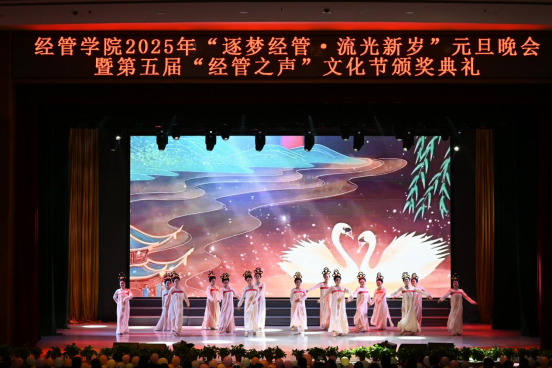 本次晚会以“筑梦经管·流光新岁”为主题,分为“岁月常新·华章续”“弦歌不辍·砥砺行”“芳华待灼·新程启”三个篇章。师生共同登台,用歌舞、小品、魔术、器乐合奏等多种类型的12个节目,为现场观众带来了一场丰富的视听盛宴,彰显出经管人昂扬奋进的精神面貌。