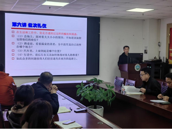 第二次培训在首次讲座的基础上,李书记重点剖析了行政工作中高频接触的位次排列难题。他从细微处着手,详细讲解了并行、单行、上下楼梯、出入电梯及房门时的先后顺序与尊位原则,并清晰梳理了在不同车型及不同驾车者情况下的轿车座次规则。同时,针对大型会议与社交场合,深入解读了“面门为上、居中为上、以右为尊、前排为上”等核心规则及其灵活应用。培训还延伸至拜访接待的全流程礼仪、电梯引导规范以及中餐宴请的举止禁忌等,有效解答了行政人员在日常工作中遇到的诸多具体困惑。
