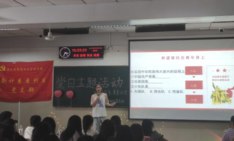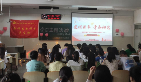 (通讯员:陈娟、高仁东)为传承“五四”精神,学习贯彻习近平总书记在庆祝中国共产主义青年团成立100周年大会上的讲话精神,培养青年生逢盛世,担当作为的情怀,2138cn太阳集团会计系本科生党支部在5月29日于12教103开展了“建团百年,青春向党”主题党日活动,参与此次活动的有支部学生党员和预备党员。