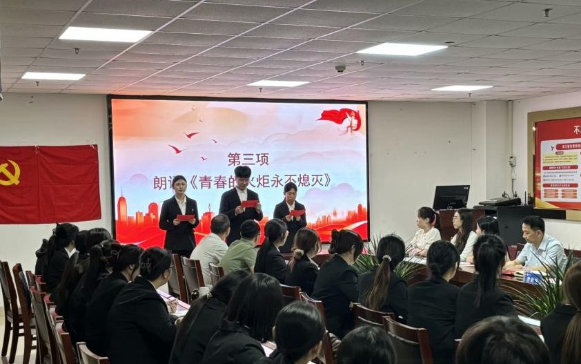朗诵诗歌环节,三名党员代表以饱满的热情朗诵《青春的火炬永不熄灭》,抒发对党和国家事业发展的忠诚热爱,现场氛围庄重而热烈。